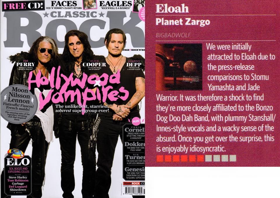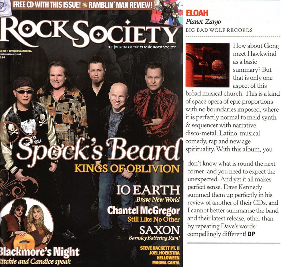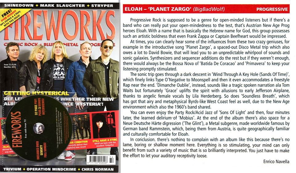 Ik kreeg een tijdje geleden een 3 tal cd's toegestuurd van Elmar C. Fuchs de drijvende kracht achter het project Eloah .. Maar helaas Planet Zargo past eigenlijk alleen maar in deze pagina met zijn mengeling van Symfonische Rock die zich moeilijk laat plaatsen. Op PZ horen we ook Meastro's Orion Roos die het album van melodie verzorgt The Glint bv is een heerlijk zelfs dansbaar nummer ( videoclip) en hoor ik wel elementen van Rockmuziek die richting Jim Steinman gaan terwijl de zang mij wat aan Mark Knofler ( Dire Straits) doet denken.. Ook voor liefhebbers van Roger Waters bied Planet Zargo het nodige.. Het album is bij vlagen soms commercieel maar laat zich niet in een hokje stoppen. 16 nummers die geen hetzelfde lijken. Uitschieters vermeld ik niet maar Wind Trough a Keyhole of time is toch wel één van mijn favoriete tracks naast The Glint.. www.eloah.at www.bigbadwolfrecords.com