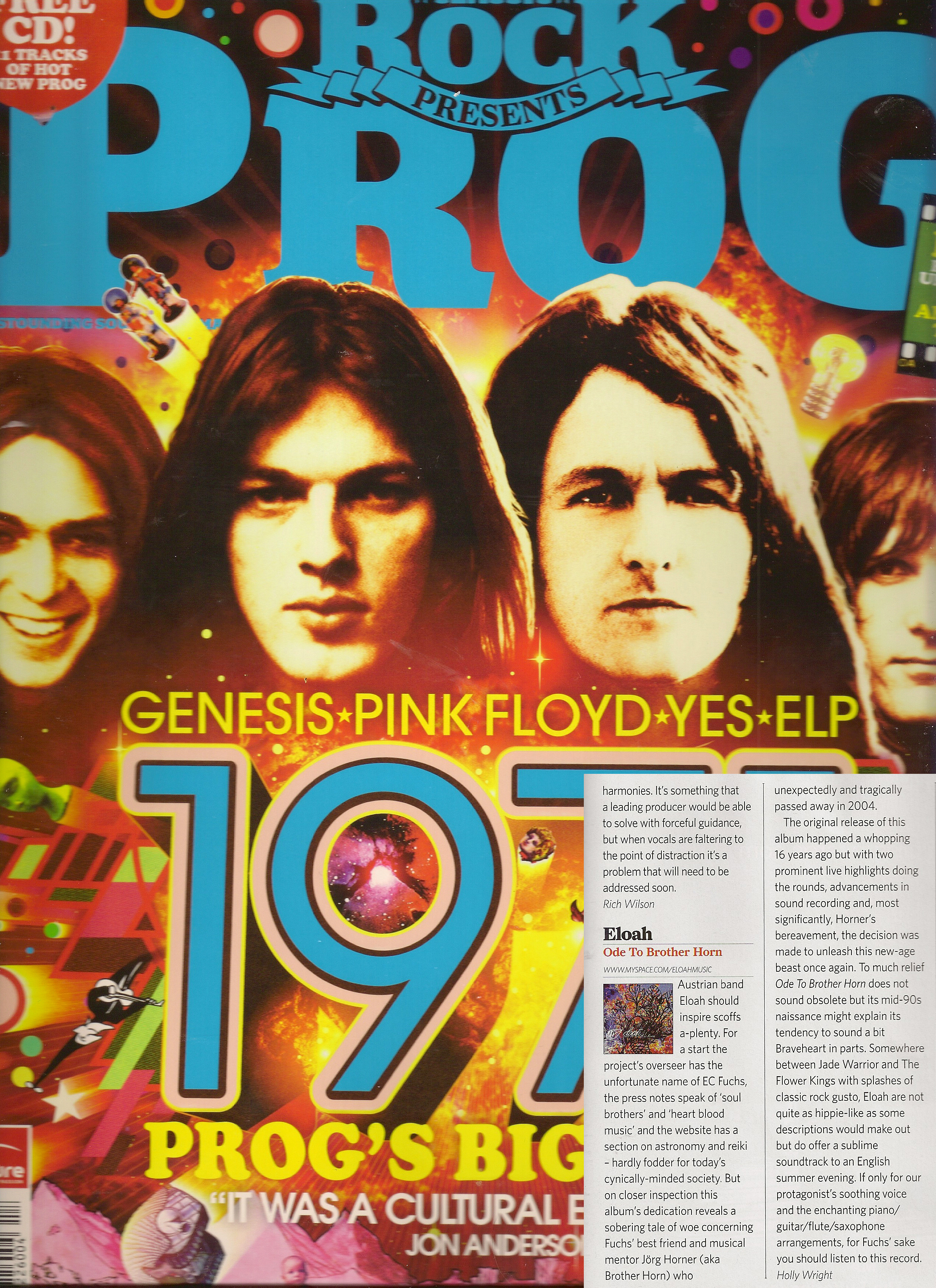 The Austrian band ELOAH has a history going back to the early 1990s when bandleader ELMAR C. FUCHS actually created the music of this CD ‘Ode to brother horn’ together with fellow musician JORG HORNER. It was Jorg who taught Elmar how to create music with a soul and in 2008 this CD was originally released, which is a tribute to Jorg, who sadly died in 2004. Musically speaking we are listening to high quality open-minded Progressive Pop/Rock. It does not rock hard or anything like that, but basically what you get is 14 well-written calmer Progressive Pop/Rock songs with a soul. It is very 1970s orientated, like early GENESIS, TEMPEST, JADE WARRIOR and a little JETHRO TULL, GENTLE GIANT and such calm acoustic tingled folksy prog. This one should go down well with the true progfans, because it is a very diverse and relaxing album that offers a lot of interesting song structures. It definitely keeps your attention from start to finish, so make sure to check out ELOAH at: www.eloah.art.net (Points: 8.2 out of 10)