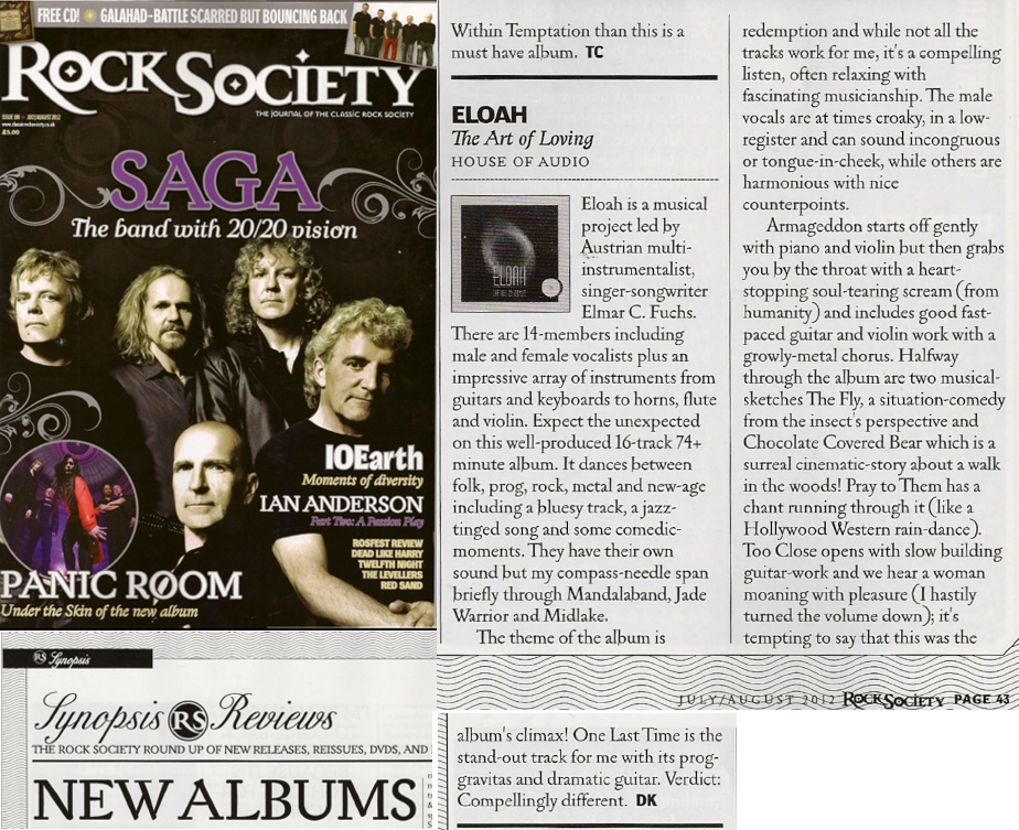 Auch heutzutage gibt es noch Bands, die sich nicht in eine Schublade stecken lassen möchten. Eloah ist so eine Band. Obwohl, Band ist eigentlich der falsche Ausdruck. Eloah sind vielmehr ein Zusammenschluss von Künstlern aus aller Welt, die sich neben der Musik auch der Malerei und der Poesie widmen. Das vierzehnköpfige (!) musikalische Konglomerat möchte sich stilistisch in keinster Weise limitieren lassen, was sie mit ihrem neuesten Album THE ART OF LOVING eindrucksvoll belegen. Auf dem Album bilden daher Einflüsse aus Art Rock, Avantgarde, Folklore, Jazz, Alternative oder New Age eine ebenso ungewöhnliche wie interessante Einheit. Mal hört man die frühen Pink Floyd (die ATOM HEART MOTHER-Phase) heraus, mal werden Erinnerungen an King Crimson, Simon and Garfunkel (der Titelsong) oder Captain Beefheart geweckt. Garniert wird das Ganze mit einem "Wall of Sound" aus Gitarren, orchestralen Chorgesängen, romantischen Flöten- und Saxophon-Tönen oder gar avantgardistischen Wendungen innerhalb der Songs. Was THE ART OF LOVING insbesondere auszeichnet ist die Gelassenheit, mit der Eloah hier zu Werke gegangen sind. Man gibt den Songs alle Zeit der Welt, sich aufzubauen, der Gesang taucht in die tiefsten Tiefen der Melancholie, um im nächsten Moment von harten Gitarren flankiert zu werden. Trotz der ungewöhnlich hohen Anzahl verschiedenster Instrumente wirken die Songs nie überladen, hier wird sehr songdienlich und ökonomisch gehaushaltet. Eine Track-by-Track-Bewertung macht an dieser Stelle keinen Sinn, THE ART OF LOVING sollte als Gesamtkunstwerk gesehen werden. Wer keine Berührungsängste mit Musikrichtungen wie Folk, Avantgarde, Weltmusik und Jazz hat, eingebettet in einen künstlerischen Kontext, der kann hier ruhig einmal ein oder besser zwei Ohren riskieren. Man sollte sich jedoch genügend Zeit für diese Klangreise nehmen, die selbst erfahrene Musikliebhaber an ihre Belastungsgrenze bringen könnte. Kein Album für den Mainstream. Kunstvoll! Fazit: Art Rocker aufgehorcht, Eloah dürften euer Interesse wecken. Was die 14-köpfige Band (oder vielleicht sollte man hier besser von einem Orchester sprechen) uns auf THE ART OF LOVING kredenzt ist ein äußerst interessanter Mix aus New Art Rock, New Age, Jazz, Rock, Avantgarde und Alternative. Eloah bewegen sich hier zumeist außerhalb üblicher Songstrukturen. Ungewöhnliche Instrumentierung, genreübergreifende, ausufernde Kompositionen und filigrane Arrangements finden sich auf THE ART OF LOVING ebenso wieder, wie wohlklingende Melodien. Keine Platte, die man nebenbei hören kann, sondern eine höchst ungewöhnliche und interessante Stilmischung, die ob ihrer überraschenden Wendungen keine Langeweile aufkommen lässt. Ein Kopfhörer-Album, keine Frage. Aber eines, das sich lohnt entdeckt zu werden!